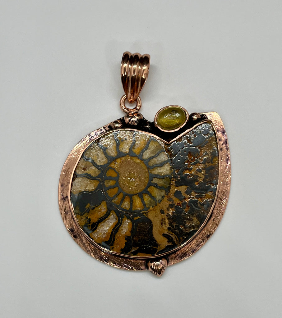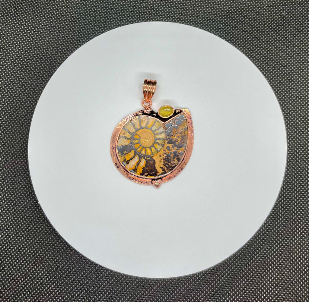 A beautiful blend of ancient history and warm, earthy elegance, this Ammonite pendant showcases the natural spiral fossil in a rich copper setting. The intricate patterns of the ammonite tell a story millions of years in the making, making this piece both eye-catching and meaningful.