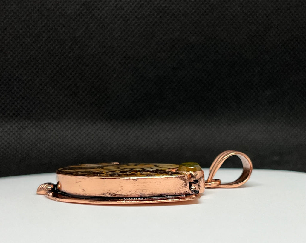 Accented with a glowing amber stone, the pendant radiates warmth with its golden hues, perfectly complementing the copper tones.