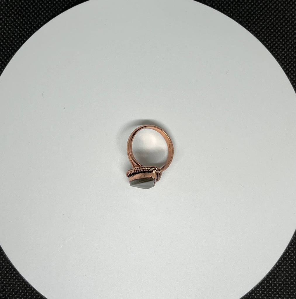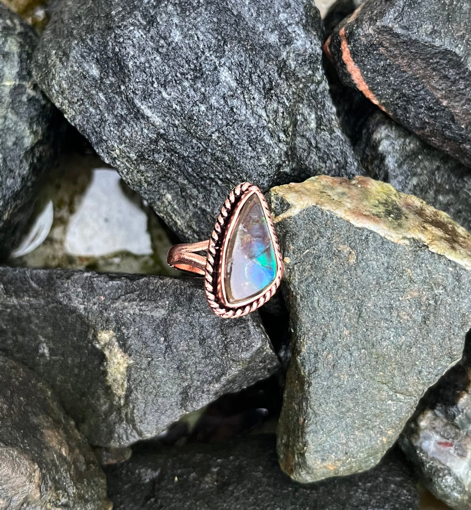 Vibrant and captivating, this Ammolite Ring set in Copper showcases the stunning natural iridescence of ammolite. Flashes of brilliant color shimmer across the surface of the stone, revealing hues that shift with the light and movement.