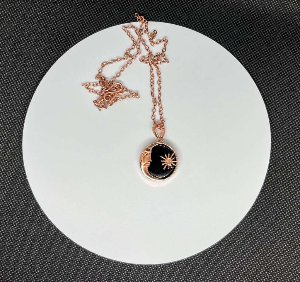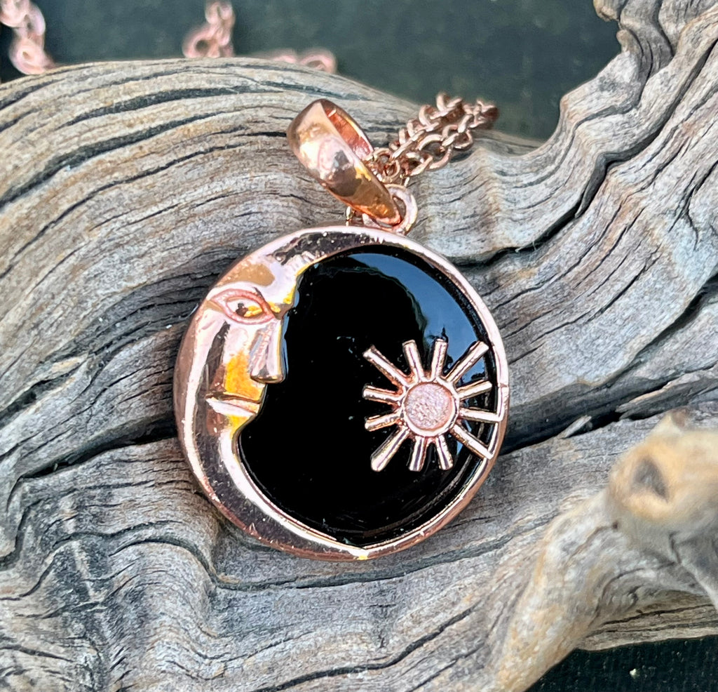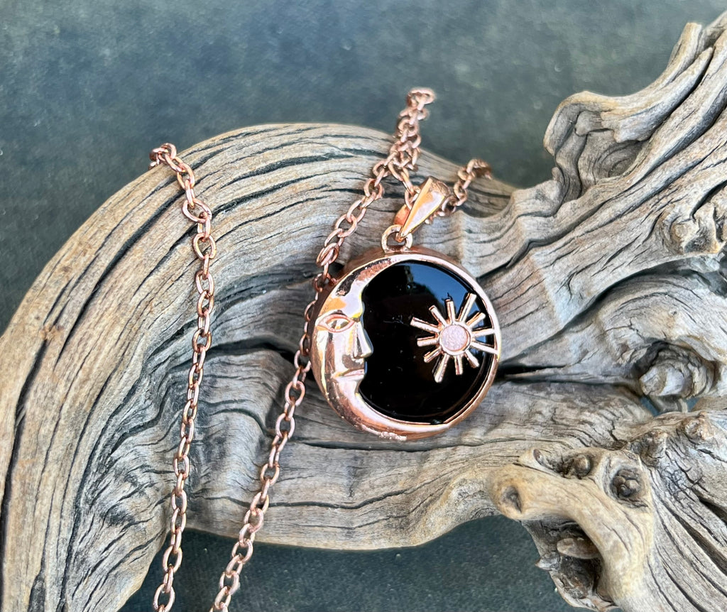 Bold and symbolic, this Copper and Obsidian Moon and Sun Necklace celebrates the balance of light and shadow. The design beautifully unites the radiant energy of the sun with the mysterious allure of the moon, creating a meaningful celestial statement piece.