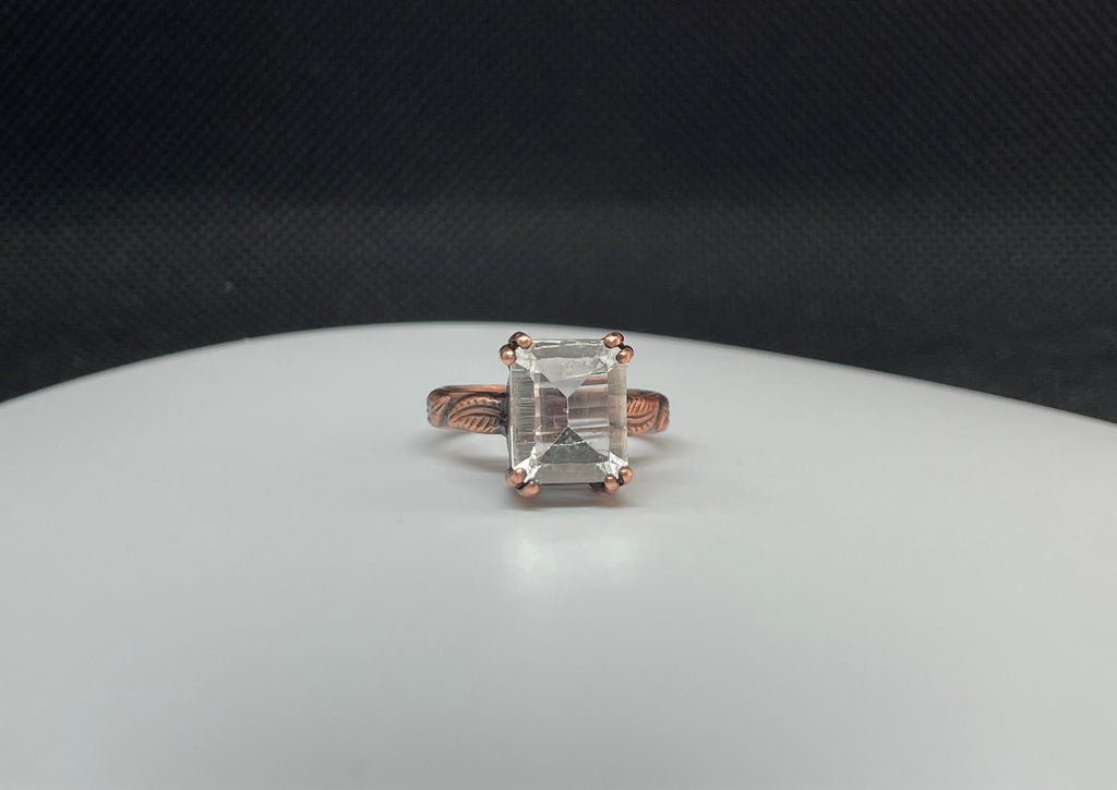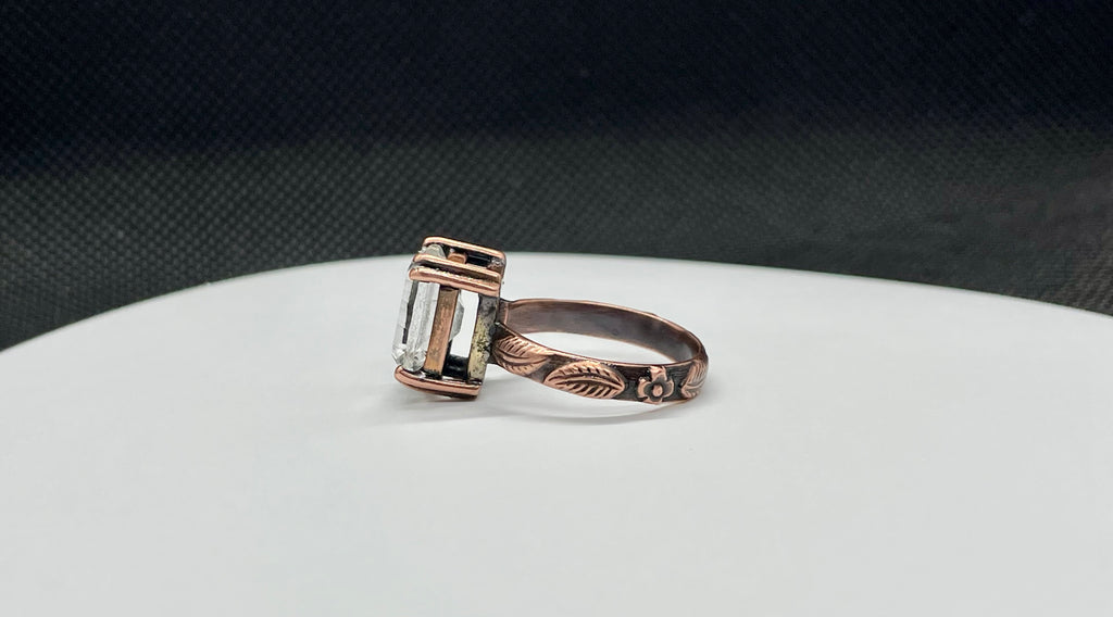 This enchanting ring features a large, faceted clear quartz gemstone that sparkles with natural brilliance. Set in warm copper, the band is adorned with delicate leaf and flower motifs, adding a touch of botanical elegance to the bold, eye-catching design.